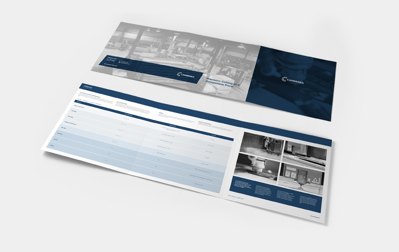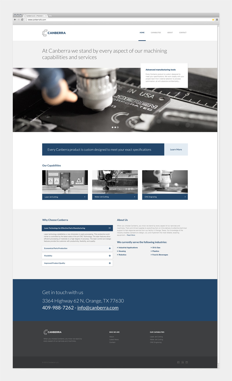 Canberra LLC is a subsidiary company from Cloeren Incorporated and specializes in laser cutting, water jet cutting, CNC engraving, and metal finishing. The site, logo, and 3 page brochure were designed to highlight their machining capabilities in a clean and modern look.